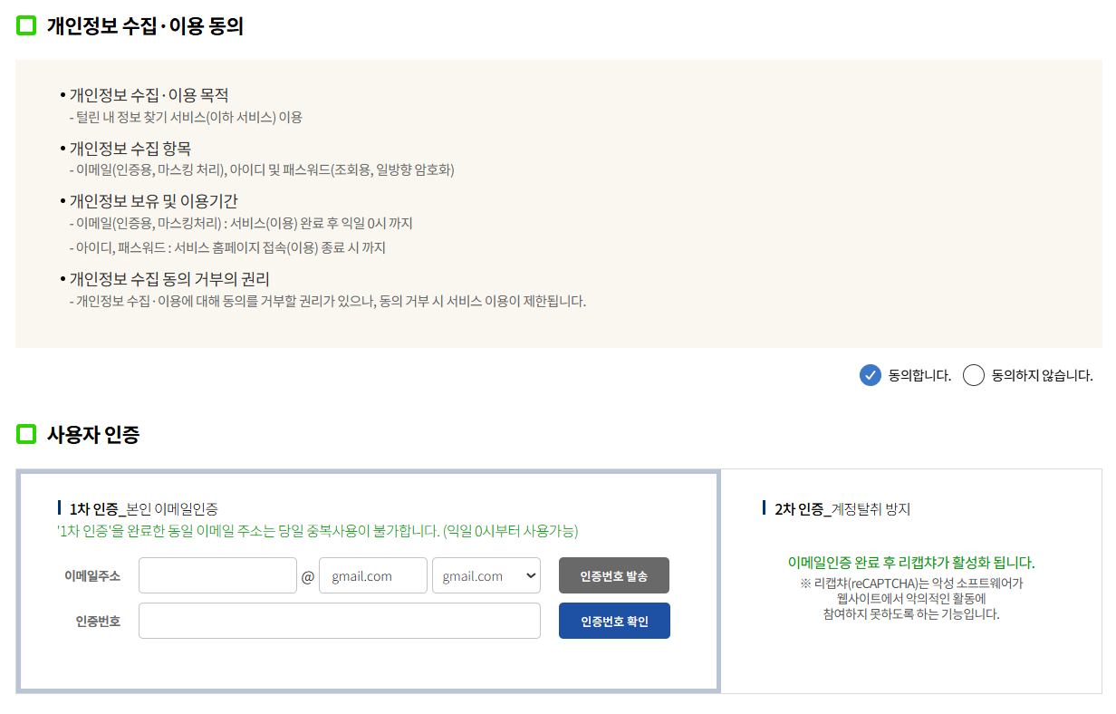 1차 인증은 이메일 인증입니다. 이메일 주소를 입력하면 인증번호가 해당 이메일로 전송됩니다.